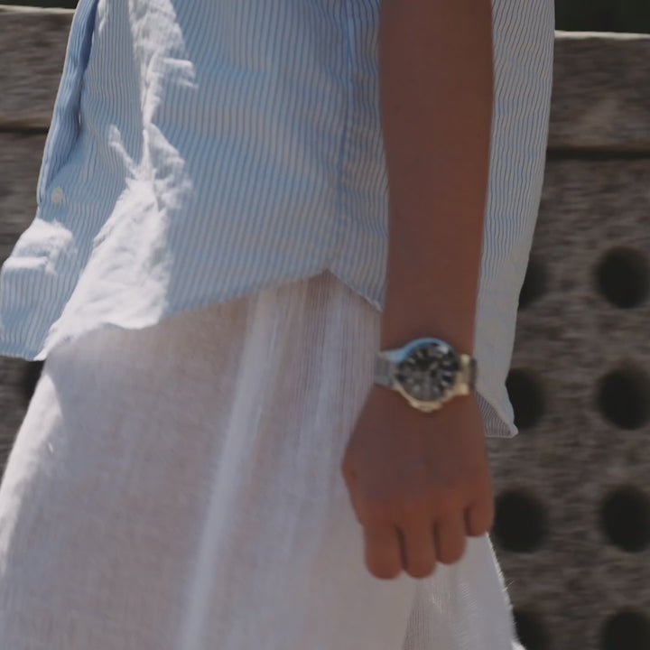 The striking Aquis Date Diamonds Watch from Oris is a luxurious everyday toolwatch. This beautiful watch features a steel bracelet and has 11 hour markers, each set with three brilliant-cut, lab-grown diamonds. Case: Multi-piece stainless steel case, ceramic minutes scale top ring. Glass: Sapphire (anti reflective), domed on both sides. Case Size: 36.5mm. Water Resistance: 30 Bar. Interhorn Width: 19mm. Movement: Centre hands for hours, minutes and seconds, date window, instantaneous date, date corrector, fine timing device and stop-second. Power Reserve: 41 hrs. Caliber: 733-1. Winding: Automatic winding. Dial Colour: Black. Strap: Stainless steel. Warranty: 2 years (Join MyOris and get your warranty extended for free to 10 years). Presented in official Oris packaging with certificate.